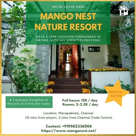 South Chennai semtindeki Mango Nest Nature Resort, arabayla 12 dakika mesafede yer alan Chennai Uluslararasi havaalanına hızlı erişim imkanı sağlamaktadır. Chennai şehrinde keyifli konaklamanız için tesis, balkon, giyinme alanı, uydu kanallı düz ekran televizyon ile donatılmış 7 oda sunar.